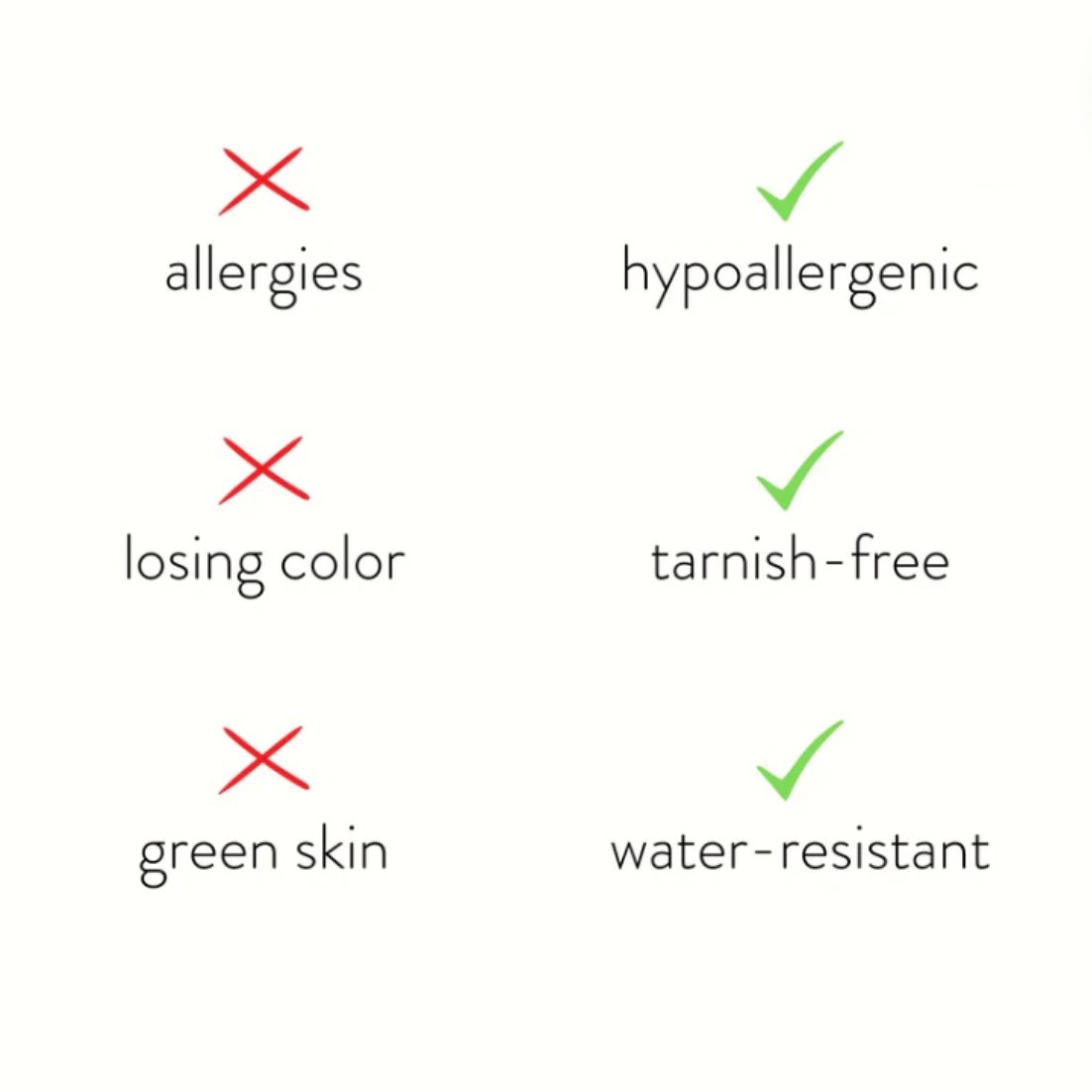 Ves naš nakit je izdelan iz nerjavečega jekla in je 100% vodoodporen ter nikoli ne bo oksidiral ali izgubil barve, tudi če ga nosite v bazenu, pod tušem ali v telovadnici.